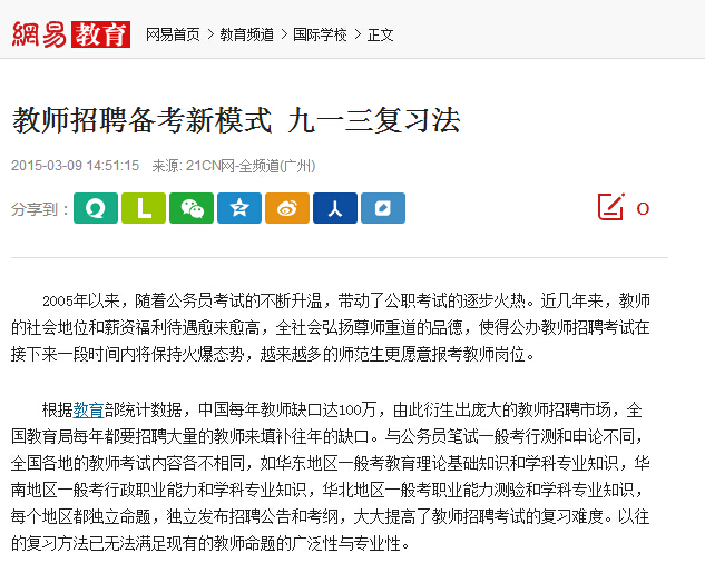 网易教育频道专门报道了教师商城独创的九一三复习法,说明该方法已得到社会主流人群的认可,教师商城将再接再厉,创造出更好更专业的复习方法,造福广大师范生和准教师朋友。详见网易报道http://edu.163.com/15/0309/14/AK996VBV00294MBF.html